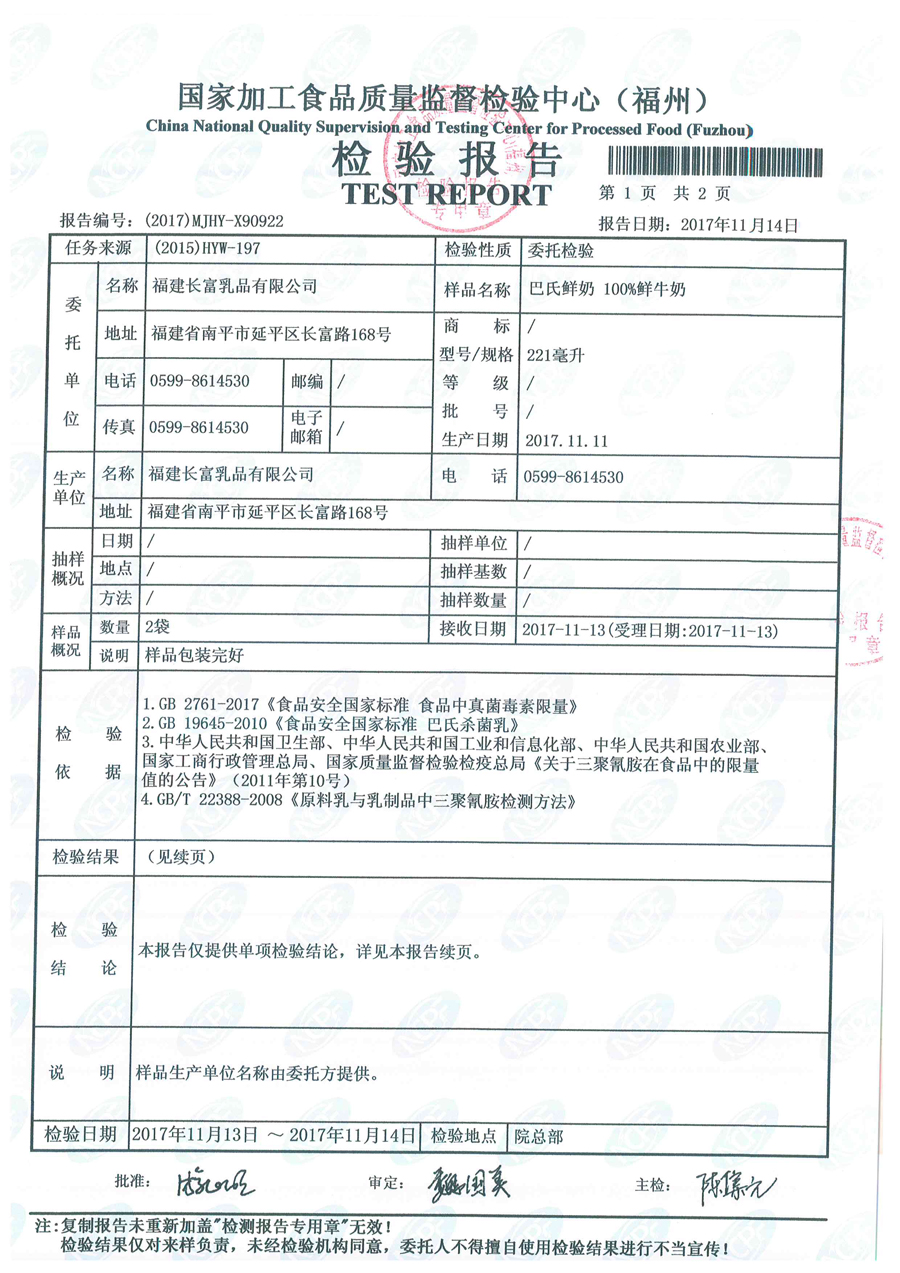 長富牛奶2017年11月11日質檢所冷鏈檢測報告