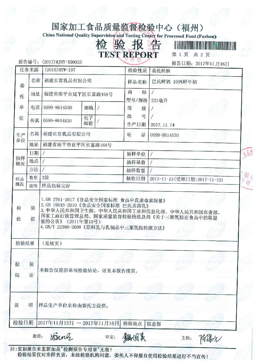 長富牛奶2017年11月14日質檢所冷鏈檢測報告