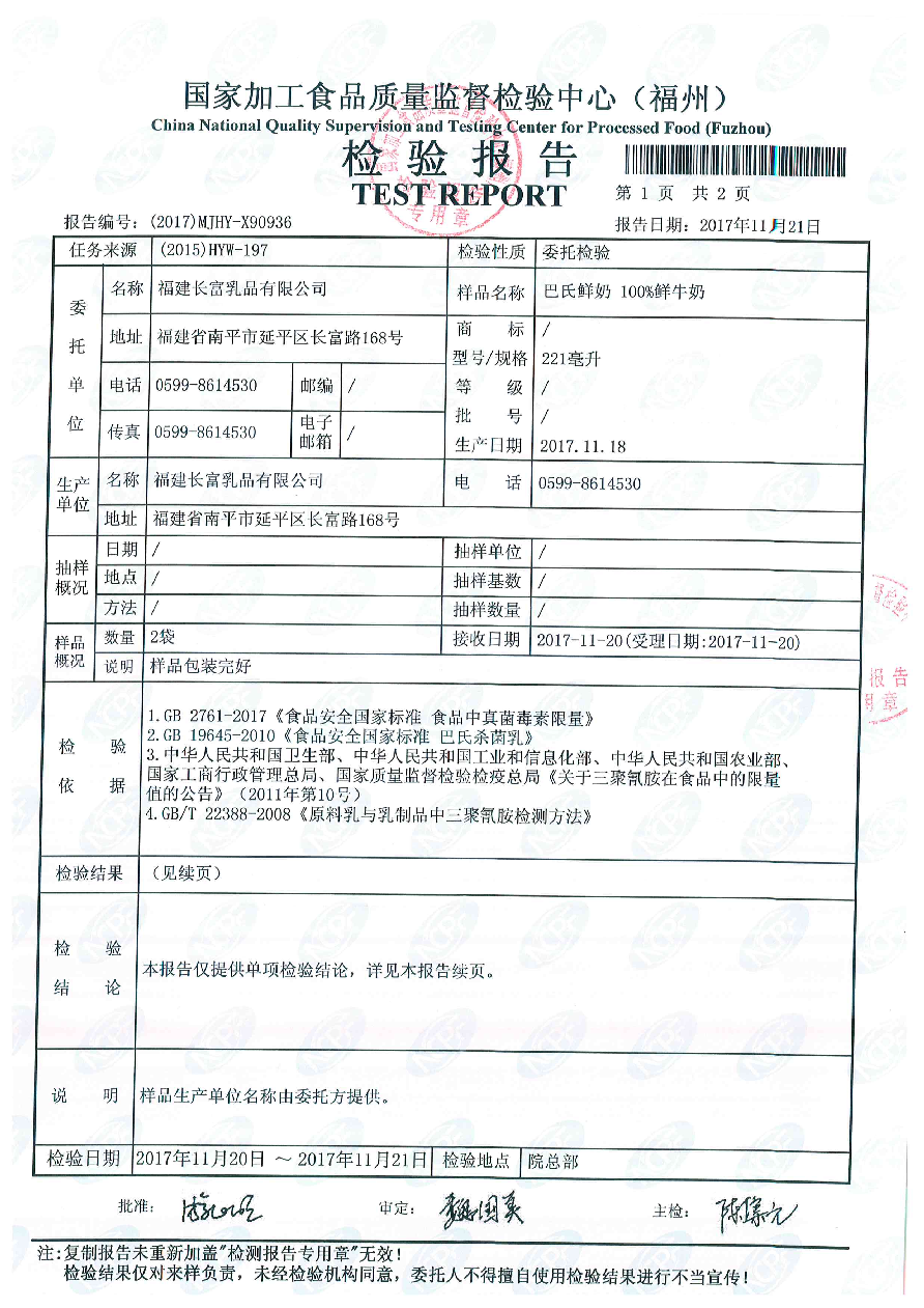 長富牛奶2017年11月19日質(zhì)檢所冷鏈檢測報告