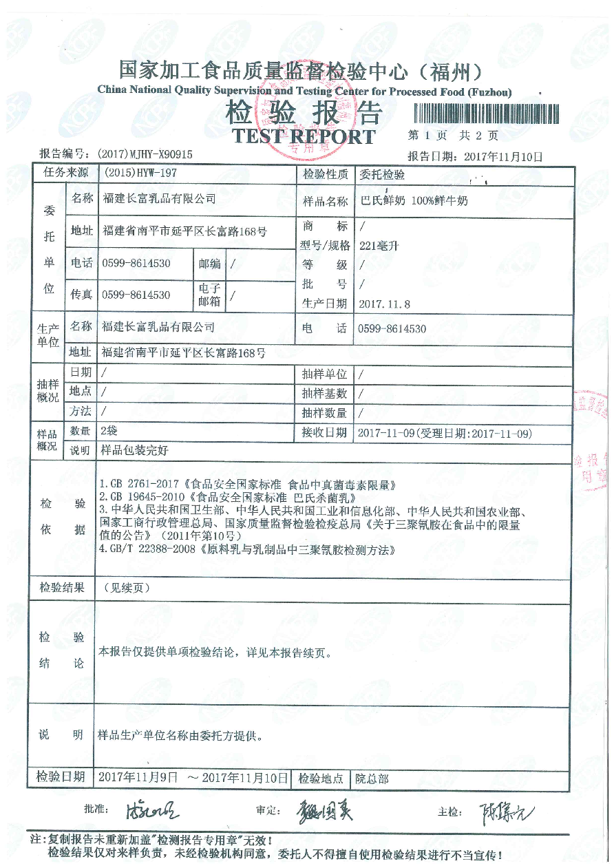 長富牛奶2017年11月8日質檢所冷鏈檢測報告