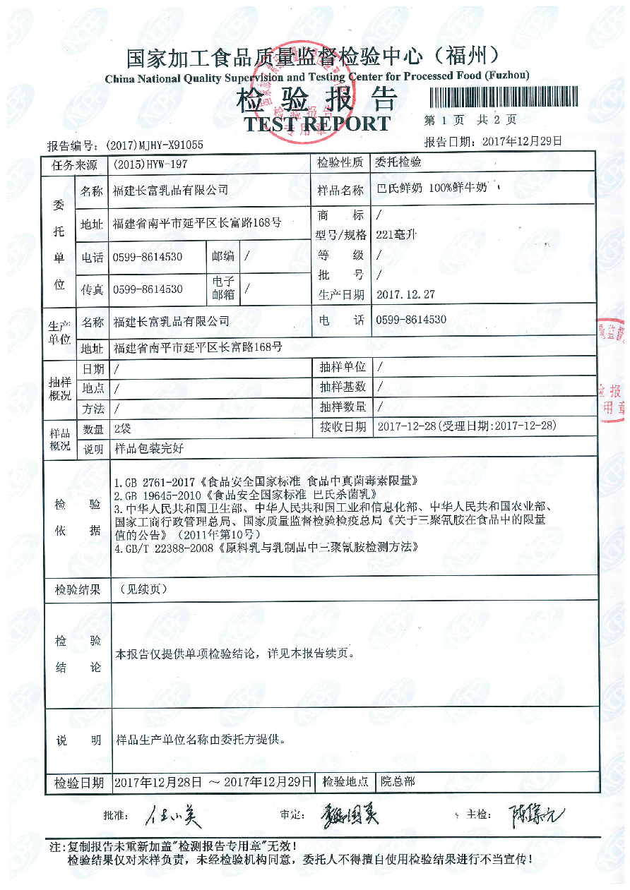 長富牛奶2017年12月27日質檢所冷鏈檢測報告