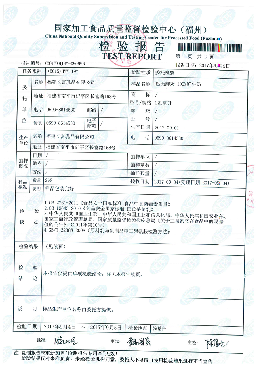 長(zhǎng)富牛奶2017年8月30日質(zhì)檢所冷鏈檢測(cè)報(bào)告