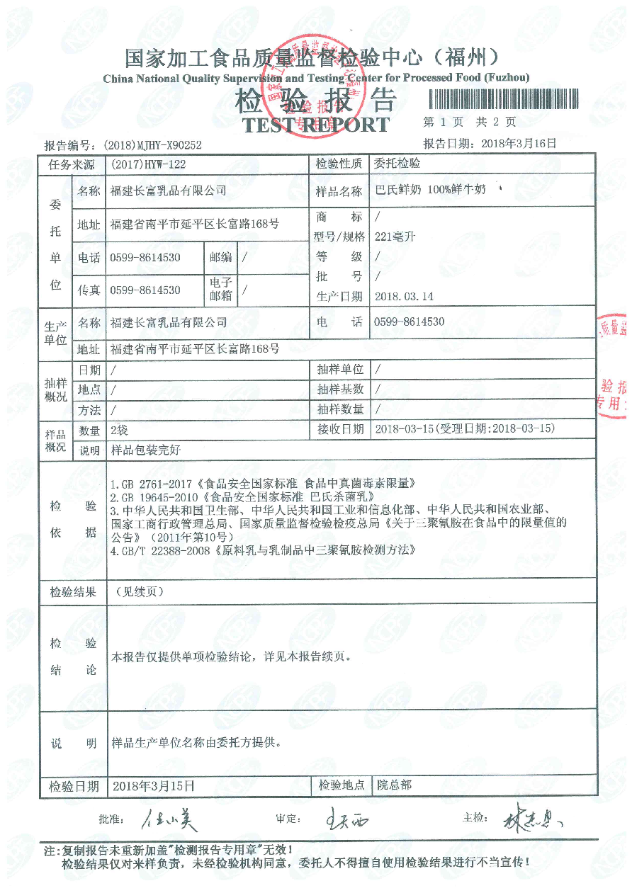 長富牛奶2018年3月14日質(zhì)檢所冷鏈檢測報告