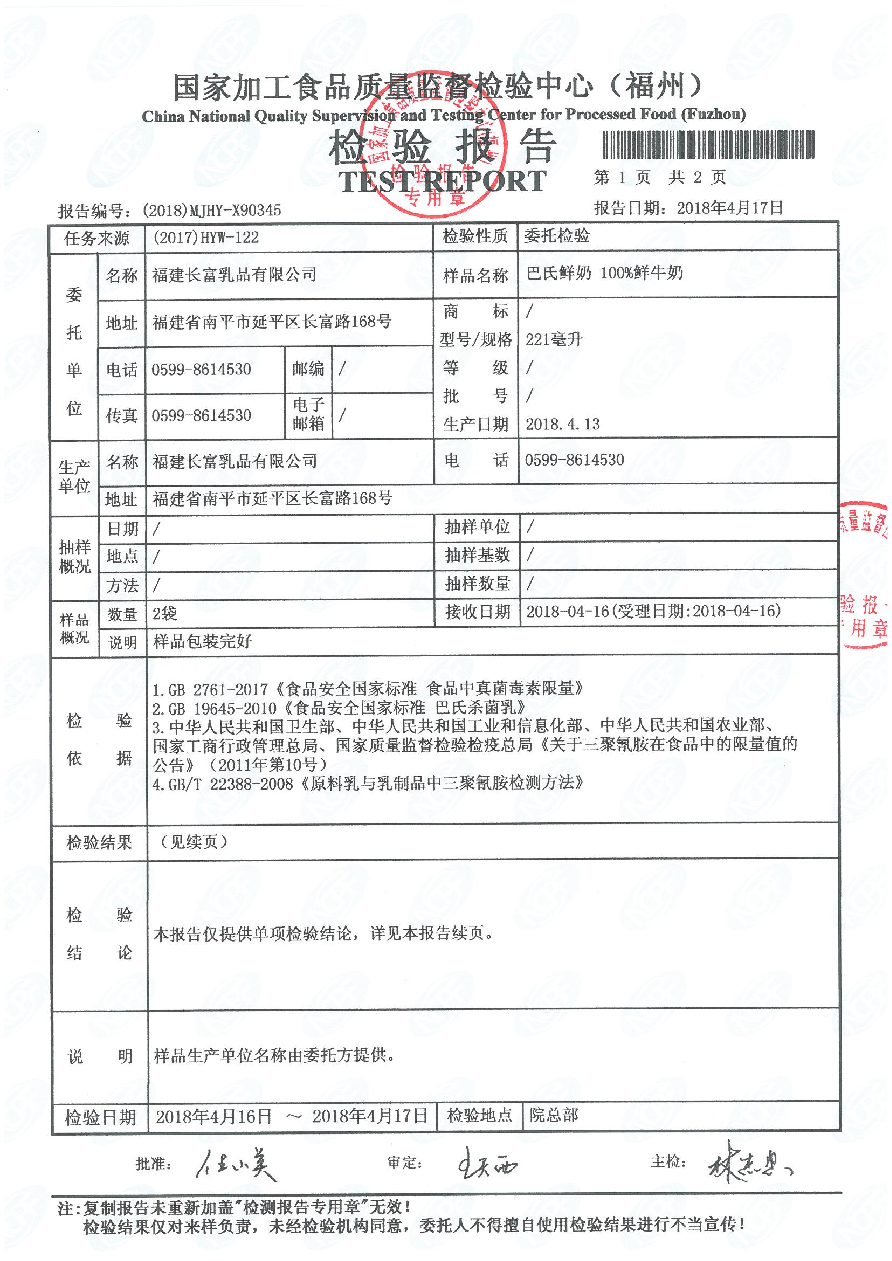 長富牛奶2018年4月13日質(zhì)檢所冷鏈檢測報告
