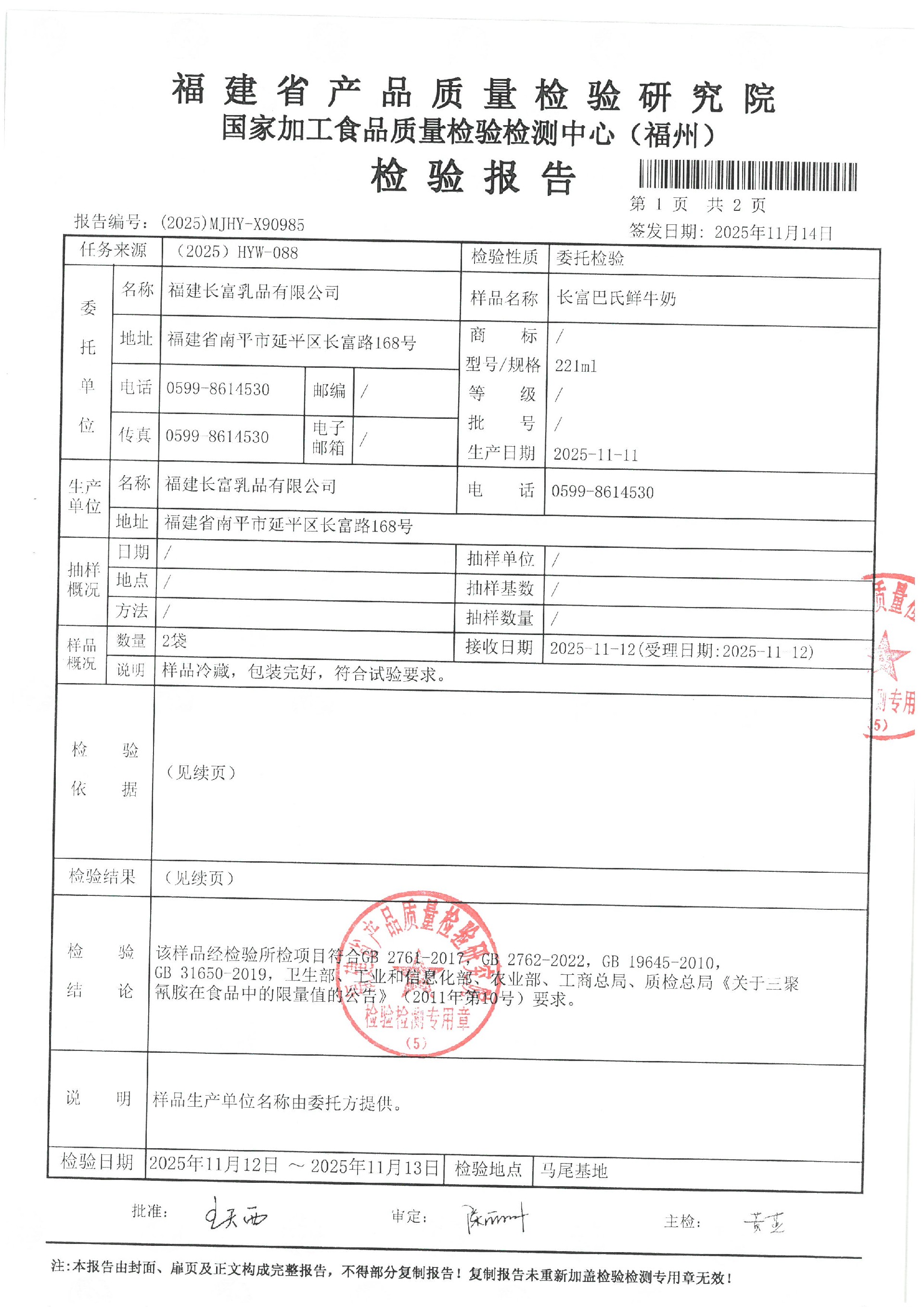 more長富牛奶2025年11月14日省質檢院冷鏈產品檢測報告