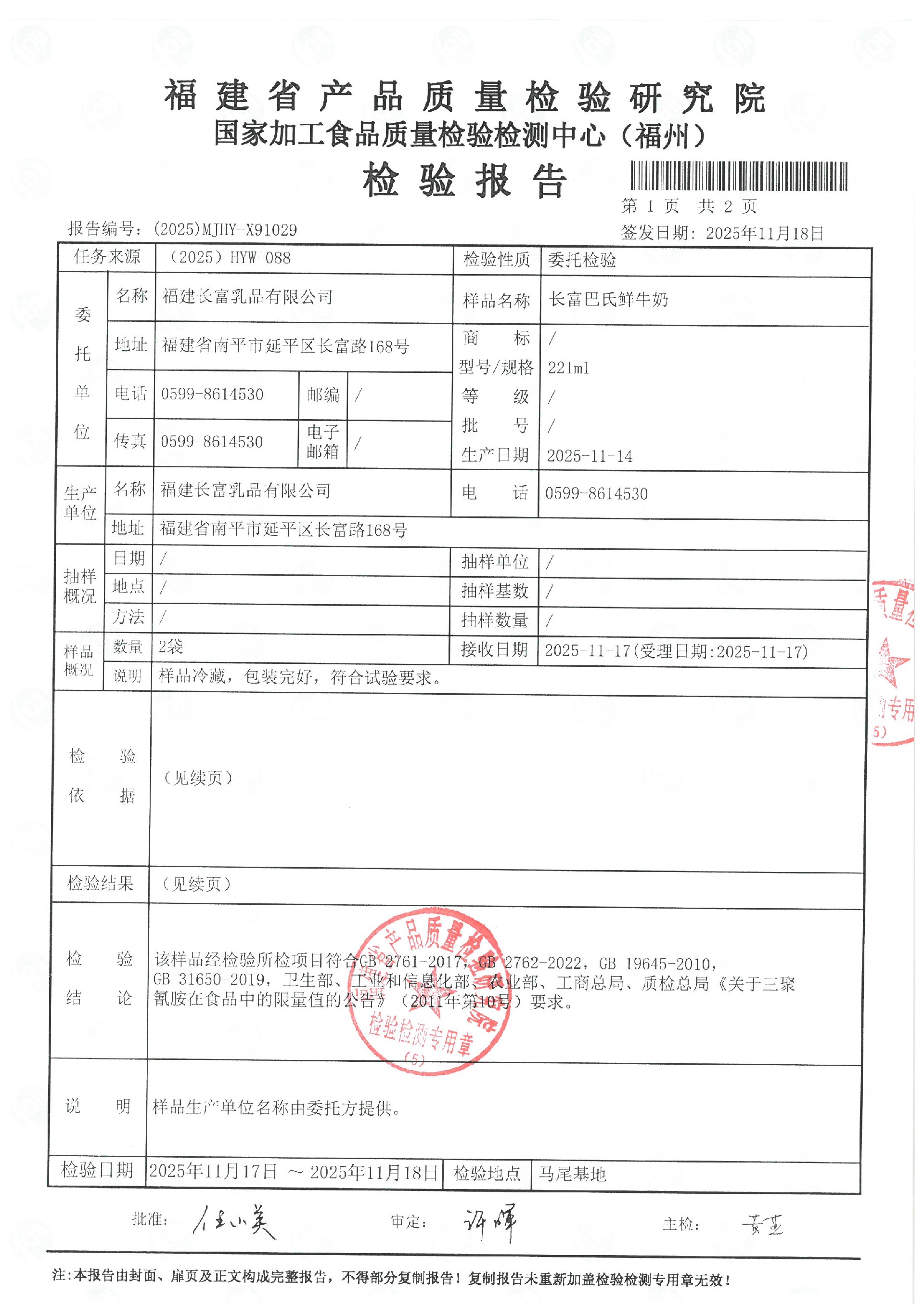 more長富牛奶2025年11月16日省質檢院冷鏈產品檢測報告