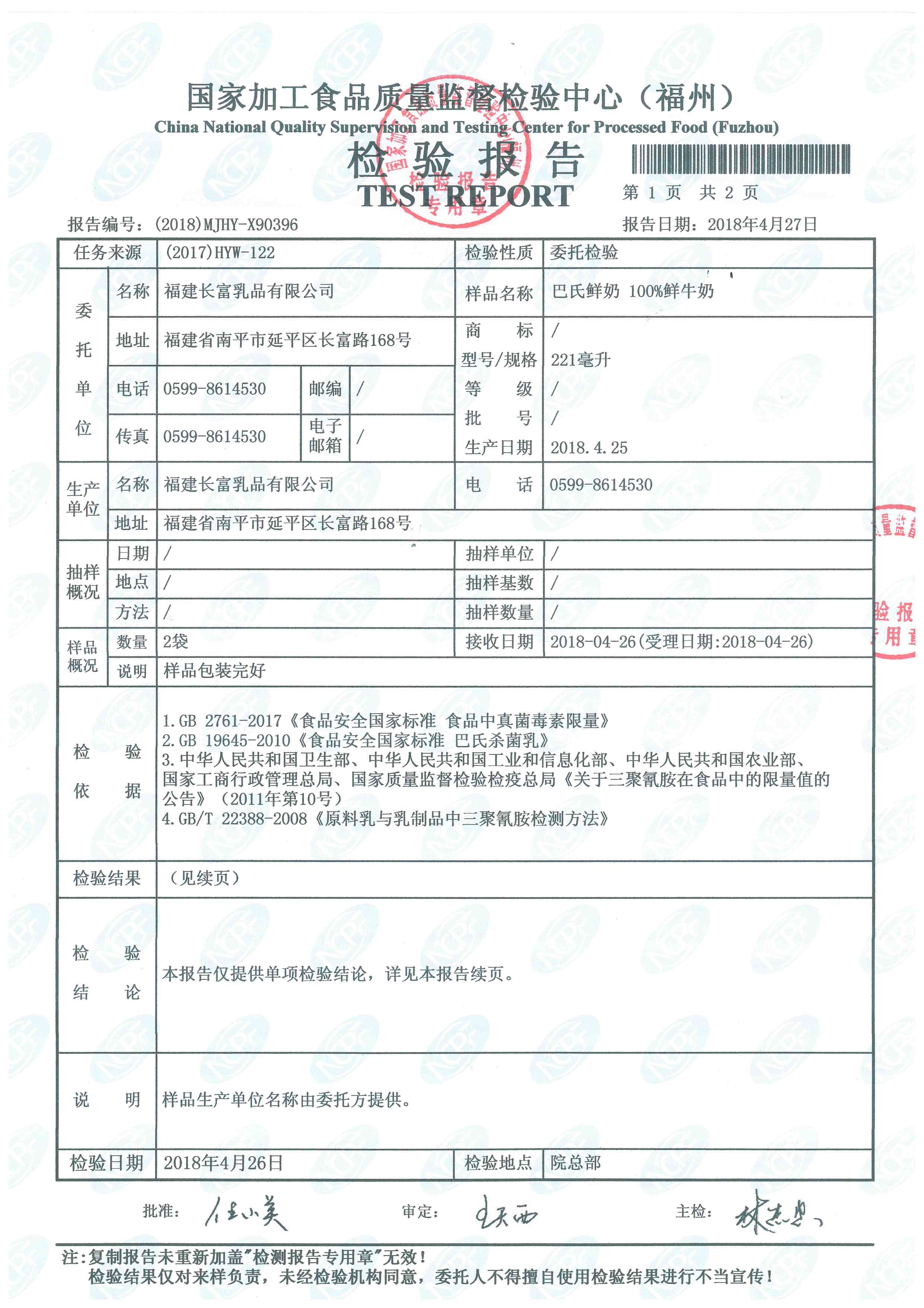 more長(zhǎng)富牛奶2018年4月26日質(zhì)檢所冷鏈檢測(cè)報(bào)告