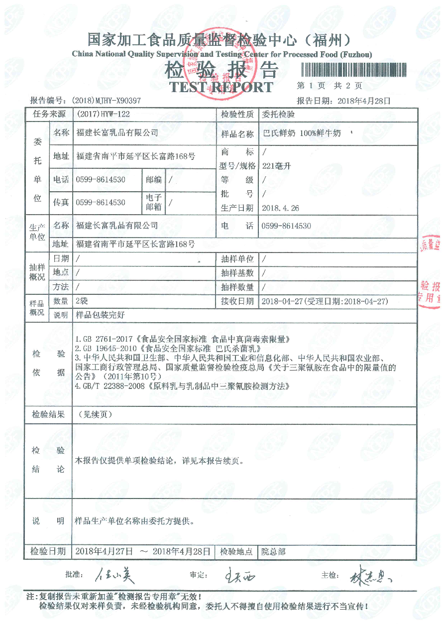 more長(zhǎng)富牛奶2018年4月30日質(zhì)檢所冷鏈檢測(cè)報(bào)告