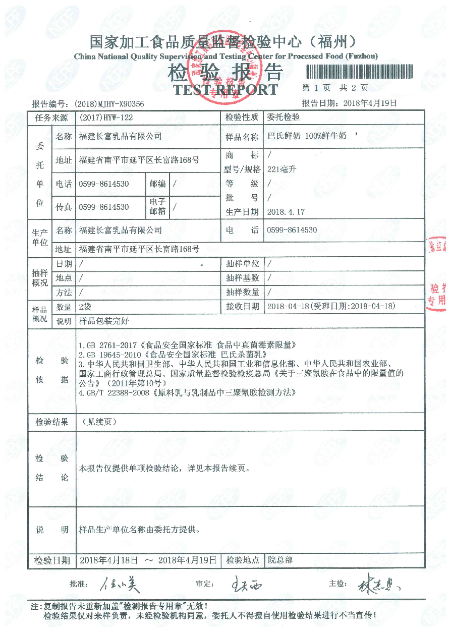 more長富牛奶2018年4月17日質檢所冷鏈檢測報告