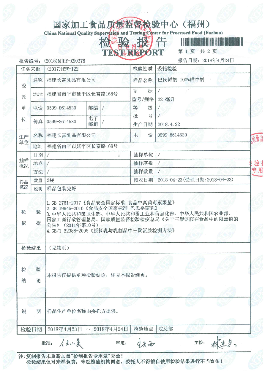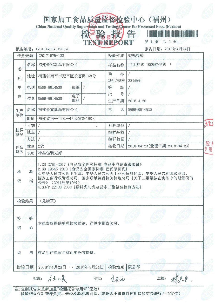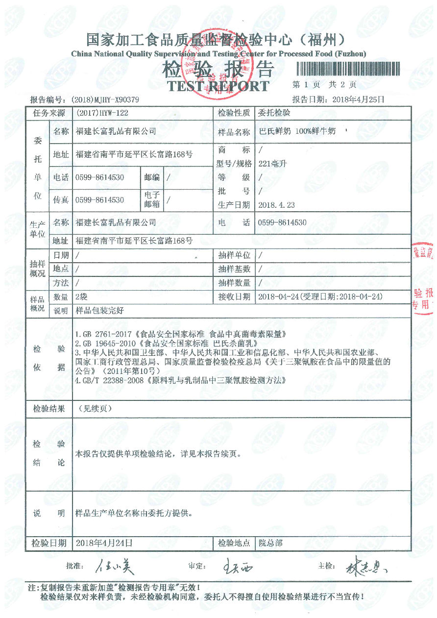 more長富牛奶2018年4月24日質檢所冷鏈檢測報告