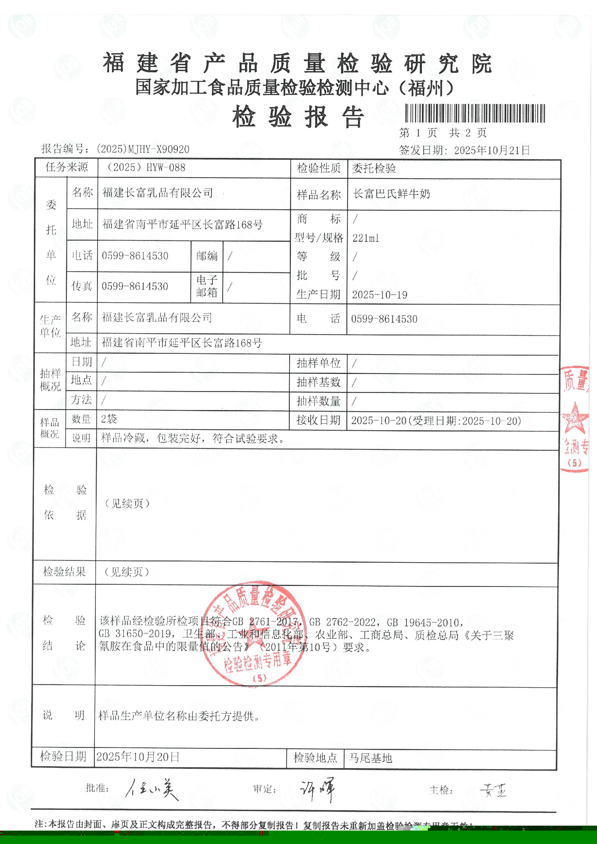 more長富牛奶2025年10月19日省質檢院冷鏈檢測報告